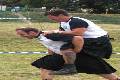 Zwei schwere, mit einem Griff versehene "Stämme" werden eine Strecke von ca. 10 m